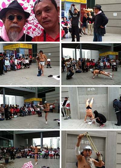 香港丸仔的表演如同一体殘者的挣扎,痛苦,扭曲!最后他想从一门缝中消失,店老板拖他出来,返复了两次.....
