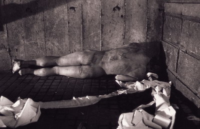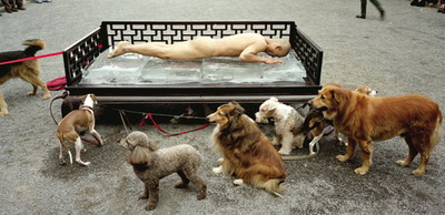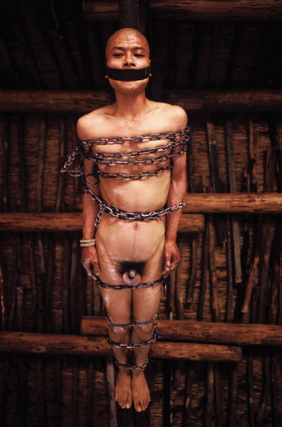 在《12㎡》的作品,张洹裸体坐在北京东村的公厕中,涂满鱼油和蜂蜜的全身,招惹无数苍蝇。而在《65公斤》(又名「烙血饼」)中,裸体的他吊在工作室的天花板上,身上伤口的鲜血滴落在地上的热锅中。