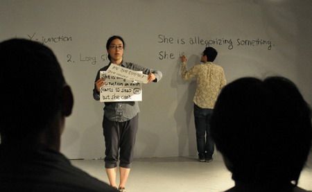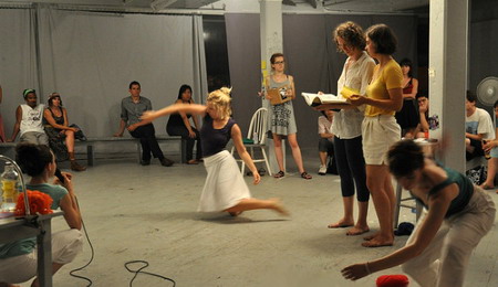 7月7日——由舞者/编舞上村惠(Megumi Kamimura)和艺术家高岛伸一(Shinichi Takashima)带来的一个观念作品,集中表现了语言的混乱和通过身体来理解抽象概念的能力。“Zen-go”被描述为一个团体,是一个“独特的日本词汇,它意思既有‘正面和背面’(空间段落),也有‘前面和后面’(时间段落)。”这种简约的美学突出了两个表演者之间的张力,并且表现了语言(口语或其他方式)能够如何在舞台上被打破。