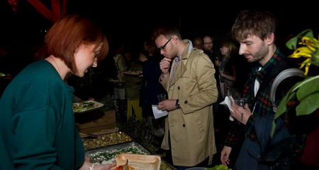 观众来了,他们走进一个场地,其中的食物生产的材料是当早直接从土地中攫取的;土地离事物只有数米的距离。当客人们拿到食物,他们便可走进园地,穿过土地,移动、调查并吞噬他们的血月盛宴。