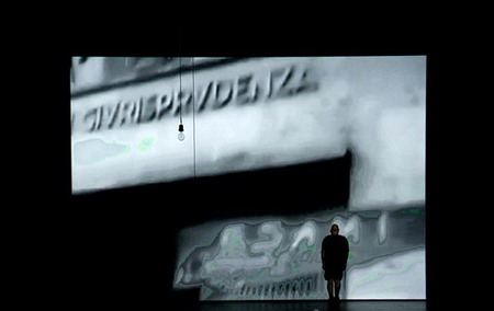 录像将表演捕捉至档案存储器上,与之并列的是关于战争、政治动荡、不公正和商品文化的图像,将集体创伤,历史元叙事(meta-narratives)和个人交织起来。随着他沿着舞台上的长屏幕动作,Franko的身体被叠加在投影的图像上。这个作品的中心是尺度与距离。一个小人物对抗巨大的背景和权力统治、侵略和集体经验。那些压迫者和被压迫者被他系统的分解为一个个姿势、动作、符号和标志,形成一种最终的破碎的叙述。