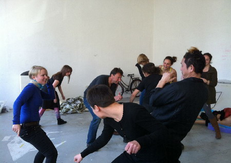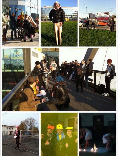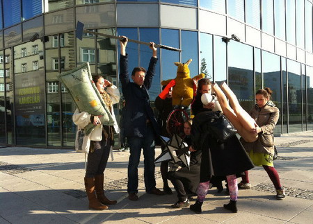 随后我跟着他搭地铁又转车来到本地的一家美术学院,Klaus在此有接连5天的工作坊,每日三个小时,我很好奇他是怎样和学生打发时间的,今天是他的第4天,我有机会来看看。昨晚就有他的学生在表演现场请我来,说Klaus在课堂上提到过我,这回我真地来了,他们的一些脸我也熟了。参加工作坊的人不多,大多是女生,只有一个男生。开始时,Klaus先让他们站起一起伸手放松身体,吸纳空气,运用太极的静默来稳定情绪。接着开始玩起自然组合,在场地中行走,或是拿着道具组合,每次以一个口号或是节排示意停下来,静止不动,定下格来,从慢逐渐加快,这样找到变化无限的生动,倒是从来不会有重复的组合。到了2点钟他带着学生往大街上走,他说离开学校,就成为行为事件了。这些学生兴趣高昂,每个人带着一个道具,向地铁站而去,这些奇怪的搭配,本身就带着一股怪异,让路人感觉到不同寻常。在Supmarkt与Jiri和其他的艺术家汇合,他们在广场上偶发,突然静态,造型如同雕塑。同样也在商场之中发生几次临时雕塑。