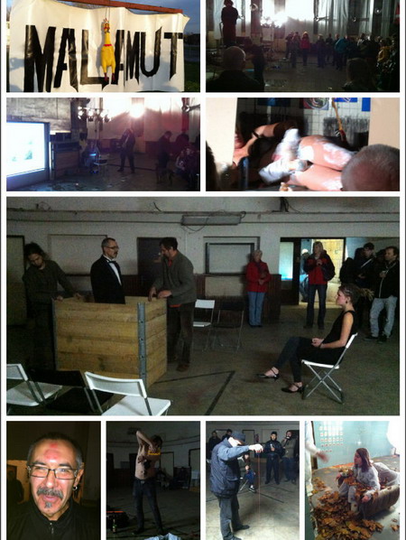 Dariusz Fodczukc 以讲话开头,让人们站上前排成一排,交叉着手接着边上人的手,按他的指示作出波浪式摆动。用一些写有字母的板子往墙上贴,他摆了一个连续的阵势,不幸的是板子都落了下来。地上还摆了几个碗,他脱掉衣服,往碗里沾水,一点点脱光了身上的所有衣服。转而再倒流程进行,又一件一件穿上了湿漉漉衣服。用喷白色食用物在地上写字,打滚又将字弄模糊。最后又回到了开始,人们又站成一排每人手持一个气球,在他的指令下用图钉将气球扎碎,求得高低不一的一串响。他的行为现在更多的成份是说话,边忙边做显得有些急促,另外,太多的程序,有些难以达成。