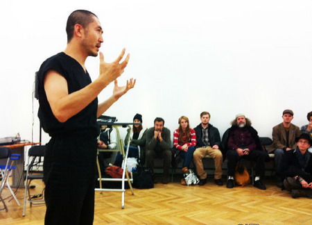 第二个表演Denisa宣布在另一边的大厅,人们全部由一边流向另一边,我和韩啸较晚过去,位置已坐满,我们只好在里圈的地上坐定,人们在等待,我们也在等待,这时Milan Kohout向我们示意,我指着自己,证明他是在指我们,大家都在看着我们,原来该表演的是韩啸了,按计划他该是第三个表演的,我们也就没在意,报节目都是用捷克语,我们当然就不知了。这时,我们醒悟过来,韩啸回到小厅去取道具,我站起迅速整理出一个靠墙面的空间,摆上一个白木台子,清理了一下周边。