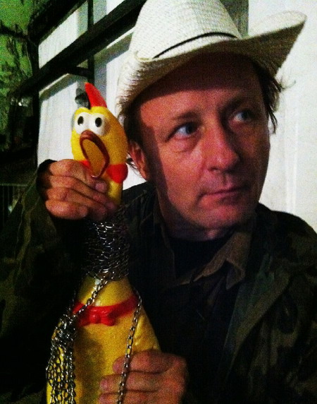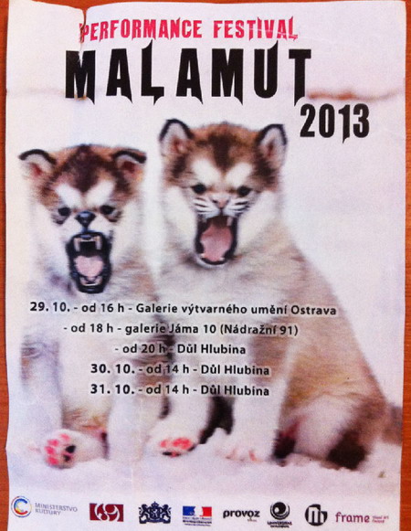 由Josef的启发,我也想次日在大街上做我的行为,从开幕式的美术馆,经过城市,再上电车伴着不时的鸡叫,或路人的互动一路走到主展场。后来由于情况的变化又省略了,改成了马上做。我从午后3:00开始走出旅馆,通过废弃的工厂缓缓走向Dul Hlbina,到达展场时还差10分4点。我已在场外艺术节醒目的Malamut大牌子上吊上了那只黄色的张口大叫的鸡。