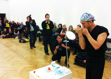 韩啸的作品是“吉-艺术家为自己整容”,他要自己给自己动手术,在自己的鼻梁上填充一下恶运标志的“断命纹”,这也是在中国命相中不吉之征。他沉稳地走到大厅中,用英语介绍他的生活,我很惊讶他的英语居然说得那么好!他说到关于他做为职业整容医和从事艺术创作的经历,直到他最近出国之前在UCCA做过的为自己移植头发的作品,加上这次将在此进行的给自己整容,关于“吉”这个作品的创作和有关中国的习俗,相书等等,我惊奇这么复杂的谈话内容他可以一直用英语不紧不慢地说下去,他冷静地态度让你对他充满信心。之后,他走回了台子边,将一个站立的镜子摆上,这是他自己特制的站镜,他又从箱子里拿出各种手术需要的材料,摆满了台面。他用一个浅兰色带有一点白花纹的毛巾包起头,他对着镜子开始他的手术工程。他在鼻根注射玻脲酸让其增高3毫米。人们睁大眼看着,全场寂静无声。他动作麻利,富有节奏,在最后的停顿下,他示意结束了手术,艺术家的自信自制的精彩表演获得全场热烈鼓掌!表演结束后还围上来许观众,人们带着好奇又惊讶的表情与他交谈。