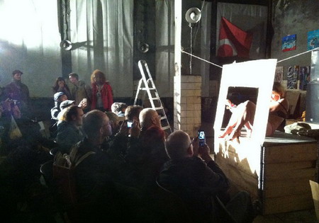女艺术家Lenka Klodova的独幕话剧式的表演相当精彩,深深地吸引了在场的所有观众。她以纸板剪裁出一个舞台show场的窗口,强烈的投影光束集中着人们的视线,影幕拉开了,她只穿内裤,两只小腿支起来对着观众,她手撑着两个玩偶在腿上爬来爬去,偶尔还如射精一样对着人们直喷精液,一不小心会喷在观众的身上,不过不用担心那是可食性有色食品。拉开第二幕算是更剌激,她干脆脱光了下身,下三角特区完全坦露在人们面前,人们的头靠得那样近,几乎是快贴上身去了。那两个小玩偶正忙呼着刮草,是在给给主人刮阴毛。如同射精一样,先喷泡沫盖满阴部,再拿起刀子刮了起来,两个小家伙轰轰烈烈大干了一场,把主人的阴毛全部剃掉。两人合作愉快,最后排掌庆贺!作品结束获全场鼓掌。大家说再来一个,艺术家再拉开幕,幽默地让人看一下她的胳膊窝,又关上了。这时音乐响起来了,艺术家的音乐朋友,那个女歌星又在台上唱起狂歌。