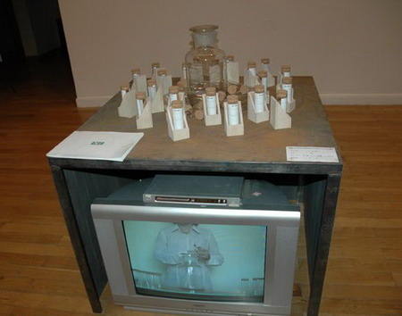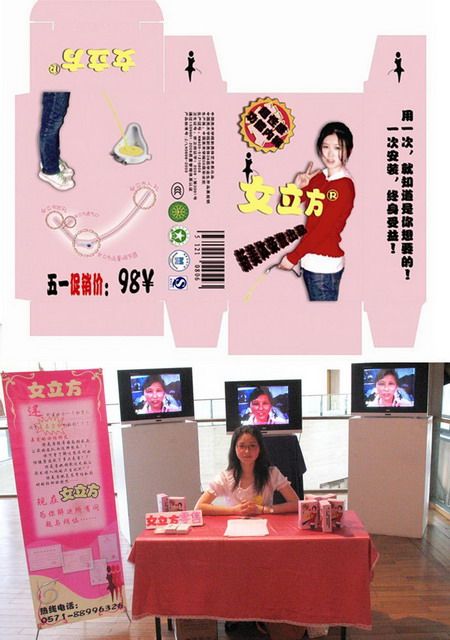 查丽娜作品《女立方》作者说明:以电视购物,现场展销的形式“出售”本人“发明”的“女立方”(女性直立方便器)。