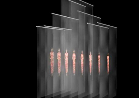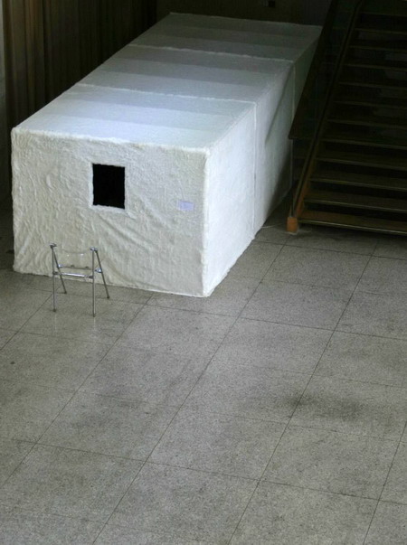 实现方式:在3.14mx3mx2m的亚克力镜面板搭建的空间里,分割成曲折迂回的通道,宽度只可容纳一人通过,像个迷宫,人从一扇门进出。同时有声音环绕其中。