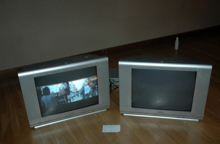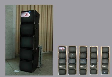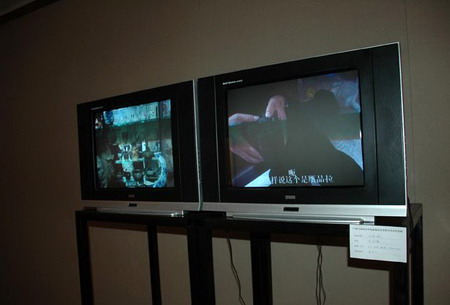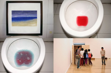 戎峥作品<午夜风景>一个1.0M宽x1.8M长x2M高的木结构房间,木板墙上挂也液晶显示器,播放静帧动画。动画内容:是一个关于及马桶周边的影像,马桶水箱上方有一个画框,画框里是海边的风景,风景是用FLASH做的有海水涌动的动画;接下来马桶开始冒出红色的水来,慢慢地往上冒伴随着气泡,谁渐渐涨满;画面在一次切换到海变风景;切换回到马桶画面,冲下蓝色的水来,把红色的水压下去。戎峥作品<午夜风景>一个1.0M宽x1.8M长x2M高的木结构房间,木板墙上挂也液晶显示器,播放静帧动画。动画内容:是一个关于及马桶周边的影像,马桶水箱上方有一个画框,画框里是海边的风景,风景是用FLASH做的有海水涌动的动画;接下来马桶开始冒出红色的水来,慢慢地往上冒伴随着气泡,谁渐渐涨满;画面在一次切换到海变风景;切换回到马桶画面,冲下蓝色的水来,把红色的水压下去。