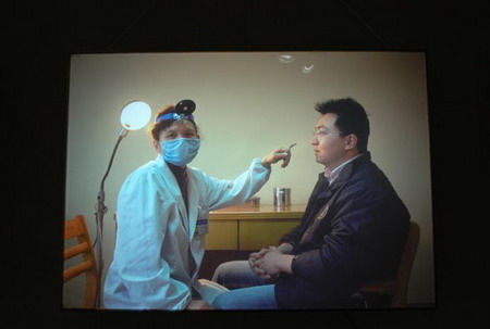 作品阐述:通过医生和病人这两种身份关系,重点去描述医生的状态。摄影部分选取几个看病时互动性较强的科室,让医生和病人都按正常看病的状态坐着,医生的的面部对着镜头,然后进行拍摄。影像部分和摄影部分是一种内容上的连接,影像中没有病人,上下一对一对齐只有医生对着没有病人的病人在进行治疗。