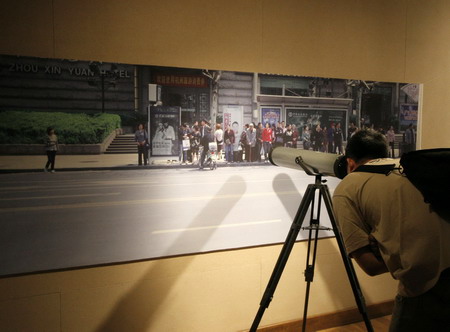 曹澍作品,《剧场》通过一个望远镜望靠在对面的照片,望远镜里可以看到这个照片的动态影像,里面有一些诡异的事情发生。