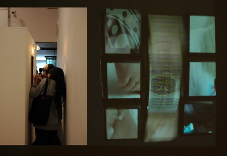 林亭立作品《昏魂混混》 在方形的空间里开个窗口,在方形空间里将已经编好的程序视频(魔方)投影到墙上,观众从窗口看到投影在墙上自己的影像,随后魔方将人像打散并与其它图片随机结合,得到一个非我的图像,使原本自己的影像产生了新的诠释。