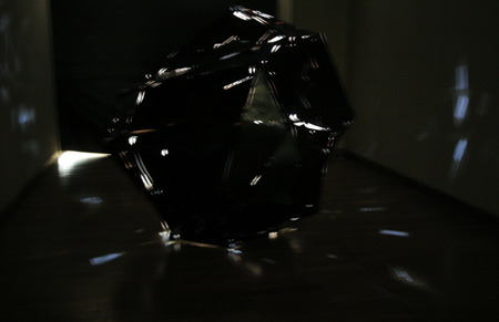 1.装置部分:在一个狭窄的黑暗空间中,放置一个做工粗糙的黑色木制不规则空心多边形物体,用低保真的做工,使得所有边缘都出现或大或小的缝隙。内部装有十只300W频闪灯,以每秒2-3次的速度频闪,另外还有一个发声设备,播放一段大约6分钟的声音,声音内容是电子闹钟的滴滴声,不断循环播放,每一次重复声音播放速率都会减慢,以至于最后滴滴声变成绵长、单调又十分刺耳的正弦波声。