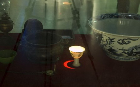 流年:玻璃柜里放置着若干件古代文物,投影从上方投进各个器皿里,投影内容是1.一条在水中倒着游的鱼,最终随水流声响飞出画面