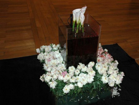 秦倩作品 《依然如爱 • 涌泉》白色的马蹄莲通过接入喷出红色的液体,60x60x80的容器里装有马蹄莲,水泵以及其他连接,外面套一个80x80x30的盒子,里面布满鲜花。
