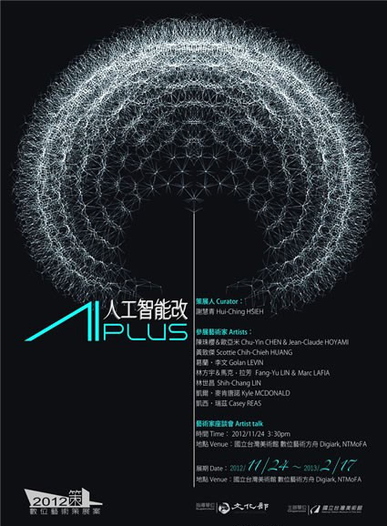 在本展「人工智能改– AI Plus」中,艺术家利用了电脑程式的演算来进行图象的生成,观众所看到的动态图象并非由艺术家们所亲自描绘,而是透过艺术家编写的程式,经过电脑的即时运算,所生成的影象,这些影像永远在变动之中,在程式编写的条件中形成,观众所看到的影象动画永远不同;也就是说艺术家所编写的『人工智能』,成为另一种形态的创作者,产生不断变化的视觉图象。
