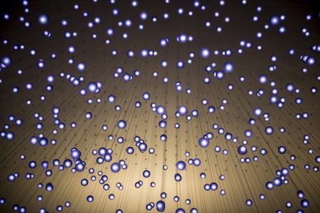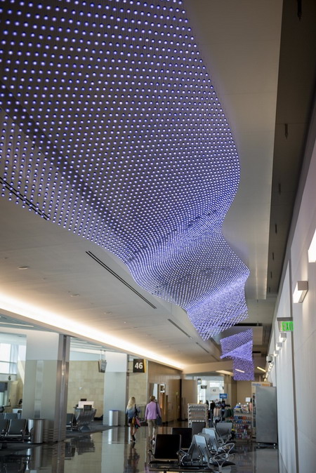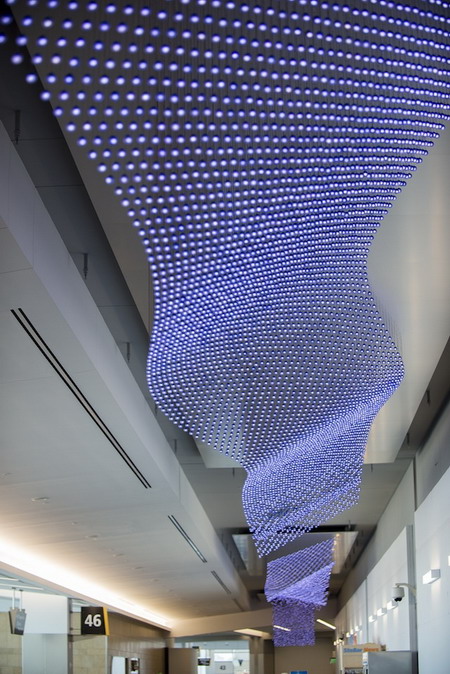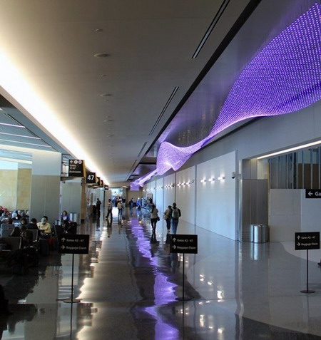 即使是旅途中的人,也有机会尽情欣赏坎贝尔的作品。例如他在Bryce Wolkowitz展出的作品《旅途》,以灯泡为载体,通过流动的、紫色的棱柱形装置播放着一些旅人的影像,伴随圣地亚哥机场那些幸运的旅客一路前行。下面我们选取了一些《旅途》的照片,绚丽可窥一斑: