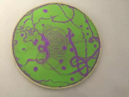 郑江的作品《蟲》由一个一个圆盘中的彩沙构成,上面有月球环形山那样的结构,和一些错综线条,鲜艳的色彩有些像放大的细菌菌落。郑江将不同颜色的彩沙分层铺好,再在其中埋入蚂蚁和一种以蚂蚁为食的虫子蚁狮。蚁狮在沙地中搭建陷阱捕食蚂蚁的过程中,会将内层的沙子翻出到外层,并在留下在沙子上行走的痕迹。