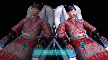 胡靖的《过滤椅》结合脑科学和幻肢体验,想像了一种排查不合格的太监的电动椅装置。一些失去了身体部分肢体的人,在某些情况下仍然能够重新感受到失去的肢体,这被称为“幻肢”现象。“幻肢”现象有时也会出现在被割除了生殖器的太监身上。由于控制生殖器和足部感受的大脑区域相连,“过滤椅”通过刺激太监足部,观察其生理反应,由此排查没有被完全阉割的太监。