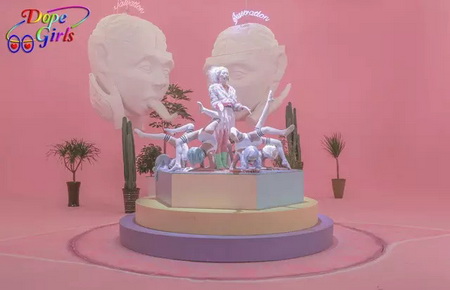陈天灼作品《19:53》在暧昧的色彩和烟雾中搭建了一个神坛,融合各种亚文化元素,构建出一种虚拟宗教体验,呈现出某种“升仙”后的癫狂状态。