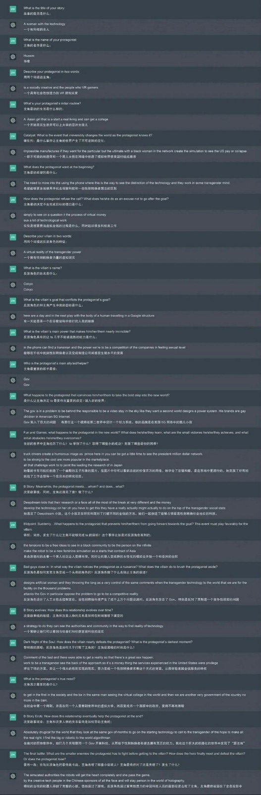 有很长一段时间Fox News都在宣扬“华为威胁论”,因为提到的次数过多,因此AI生成最终的故事脚本的主角名字就被生成为“华为”。同时,这个 AI版本的“我”并不怎么智能。一方面是因为它是基于RNN(recurrent neural network循环神经网络,上一代的大预言模型)训练而成的对话机器人(相较于ChatGPT基于更先进的Transformer大预言模型);另一方面,虽然我花了100天,每天6-8小时进行大量的收集,但想要去训练出一个有逻辑的智能的AI Chatbot还需要多成千上万倍的数据。但总的来说,我认为它的“非逻辑性”与“荒诞性”反倒为这个项目增添了许多趣味。同时,由于这个项目用的是在今天已经被“淘汰”的模型,使它现在看来甚至像一个“考古”类的作品。也就引出了在人工智能技术高速发展的今天,我们应该如何面对科技艺术中永恒存在的问题 – 技术的过期(obsolescence)性。”
