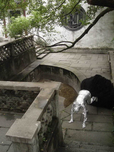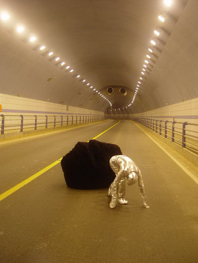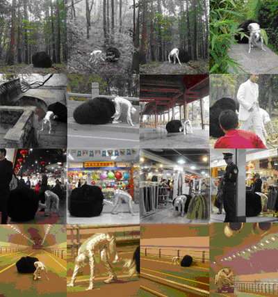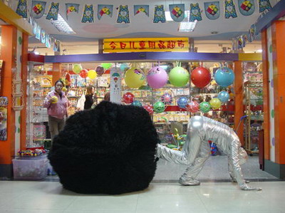 这是第一次尝试用VIDEO来记录行为。身穿太空服的“未来人”出现在杭城的各个有代表性的公共空间里,后背对着毛毛球做着模拟屎壳郎的运动。我营造了一个荒诞的视觉形象使其出现在貌似正常的社会秩序里,给稳定的生活带来了一圈圈的涟漪。