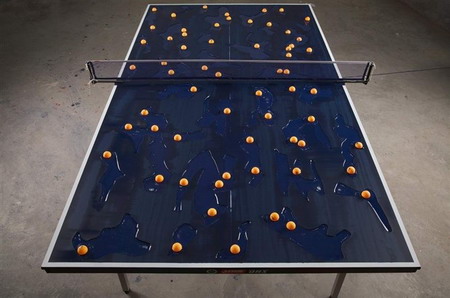李青另一个重要的游戏工具是乒乓。乒乓是中国人最为普及、日常化的体育运动之一,国际语境中的中美“乒乓外交”也使小小银球染上了一种历史与现实政治的集体记忆。这些,李青自然不陌生。他看重乒乓,爱屋及乌,就把与乒乓相关的一系列软硬件如球、球桌、运动空间和游戏规则等等,都当作实验材料、资源进行关注、开发。李青从改变乒乓球和球桌的常规功能入手,把乒乓球桌当作画布、木刻板材,甚至当作艺术行为的道具,从中提炼各种陌生化、非常规的体验与观者分享。李青似乎把乒乓球游戏当作了一个合口味的玩具,随心所欲地摆弄、颠来倒去地解析。假借艺术实验之便,他把乒乓球和球桌的物理形态不断拆开又重组,大玩排列组合的逻辑游戏;同时又将其词语形态不断悬置、异化,转换成不同的观念形态。李青《软陷阱》系列作品一直沿用乒乓材料。在2007年《迷彩》、2008年《游戏没有结束》之中,乒乓球桌和乒乓球其实就是画布、颜料替代品,是表述艺术观念的另类材料、道具。其中,却不乏传统媒材体系惯有的美学趣味,如白色乒乓球的谋篇布局和形式表现,桌面刻纹的韵律和的节奏控制等等,都在艺术的名义的下得以保全。而在2009年《肌肉》、《肢体》和2010年《荣誉》之中,球桌上刻纹、肌理又与手绘图像相辅相成,提示出人的身体与乒乓道具材料相关联的一块块记忆碎片。2007年《乒乓》作品中,李青又试图恢复乒乓这种现成品材料的日常功能,以功能性的体现来干预艺术陌生化语境的能指所指逻辑。《乒乓》中乒乓球和球桌仍可以玩、甚至可以进行正常的乒乓竞技。而录像视频显示,玩第一遍球的人其实是作品实施过程的操作者。分布在两边桌面上的红色中国地图和彩色世界地图,因油彩未干而被弹来弹去的球频频点花、溅开。之后,中国地图的红色油彩发散式地绽放,斑斑驳驳缀满整个乒乓桌面。这一形态被李青留置、风干,从而保留为一种常规作品的语言表征。《乒乓》实施和展示过程中,材料的功能化和艺术化之间的随意切换、跳跃和并置,使李青获得驾驭装置材料的极大自由度。