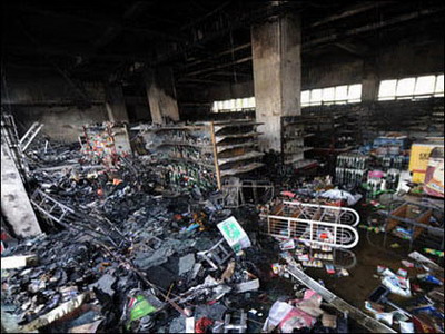 7月6日,乌鲁木齐市一家被烧毁的超市一片狼藉。新华社记者沙达提摄