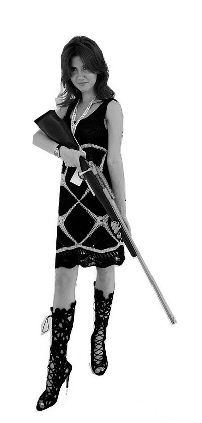 普京绯闻女友之一、俄罗斯前“美女间谍”安娜·查普曼在ORSIS精密武器系统展位持枪摆造型。