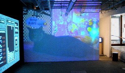 Cory Arcangel、《超级玛丽云v2k3》、2002、调整的任天堂游戏系统和卡带。装置现场、利物浦、英国、2004。可以说是阿肯吉尔最出名的作品或是代表作吧。