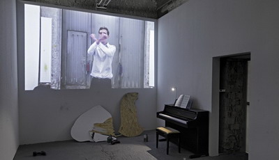 一个带有舞台元素的装置展示在摄影机之前,把展览空间进行了重新的布局。在奇怪的娱乐表演秀中,观众被带入到不同的情境中去,得完成不同的任务。通常来讲,一个行为表演是和它被拍摄下来同时进行的。随后,这个视频将作为展览的一部分,展示在空间里。