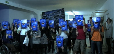 问:你在视频里的精力和个性表达令人印象深刻。有一个特别棒的时刻,就是所有的观众都戴上蓝色的面具然后看着你。他们在视频中的确形成了“转换”。他们看起来很被动,但是很有效率。