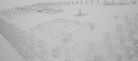 这次在当代唐人艺术中心的计划,王度建造了一个莫须有的“中国当代美术馆”,貌似一个巨大的建筑结构模型,而建筑主体则好似一个切成四段的“航空母舰”建筑群,甚至还有复杂的“地下设施”,建构成一个功能全面的美术馆机器。这个疯狂而又偏执的乌托邦式美术馆计划,锈迹斑斑呈现在我们眼前,带着强烈的“复古未来主义”气质,却昭示着现在时的缺席:在盛世强国的今天,哪里可以找到一所真正具有文化使命感、功能齐全和运作专业,并能承载中国当代文化的国家美术馆?