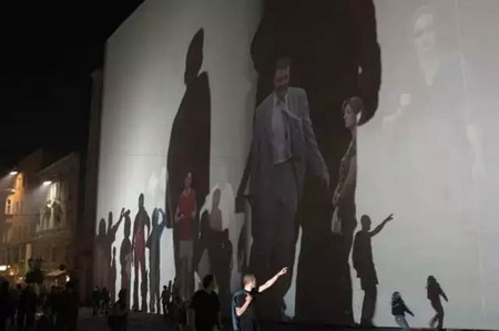 互动艺术的先驱洛拉斐尔·扎诺-亨默在2001年欧洲文化之都——鹿特丹创作的大型户外艺术作品:艺术家在街头记录下鹿特丹数千名居民的影像,混杂着路过的观众的影子也会被投放上去,随机投放在1800平方米的建筑外立面上。