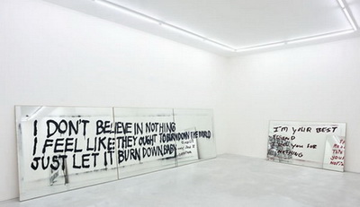美国多媒体艺术家萨姆·杜兰特作品《在新自由主义中的镜像旅行》(Mirror Travels in Neoliberalism,2010年)之一部,画面左侧玻璃上喷绘的句子是:“我不是不相信任何东西,我觉得他们应该把这个世界烧毁,就让这个世界被烧毁吧。”右侧玻璃上写道:“我是你最好的朋友,我毫无理由地杀你。”