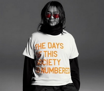 泰国裔艺术家里克力·提拉瓦尼与他自己设计的T恤,上面写着:“这个社会来日无多。”