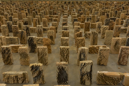 《浅山》是由一千五百块旧砖在展厅地面上组成的大型装置,每块砖表面都由手工切割出各种深浅不一的沟痕。邬建安并没有把这些砖当作建筑的元素,而是赋予了每块砖一个独立的身份,再次引发了对个体与整体之间的关系的思考。而作品《大骨架》则运用海螺与贝壳为独立元素,并在每颗海螺或贝壳上都画上人脸,充分体现出大自然中即便同样的物种也各有自己的特质。这件作品以海螺贝壳为个体组成了本次展览中最清晰的图像,即一具巨大的猴骨架。