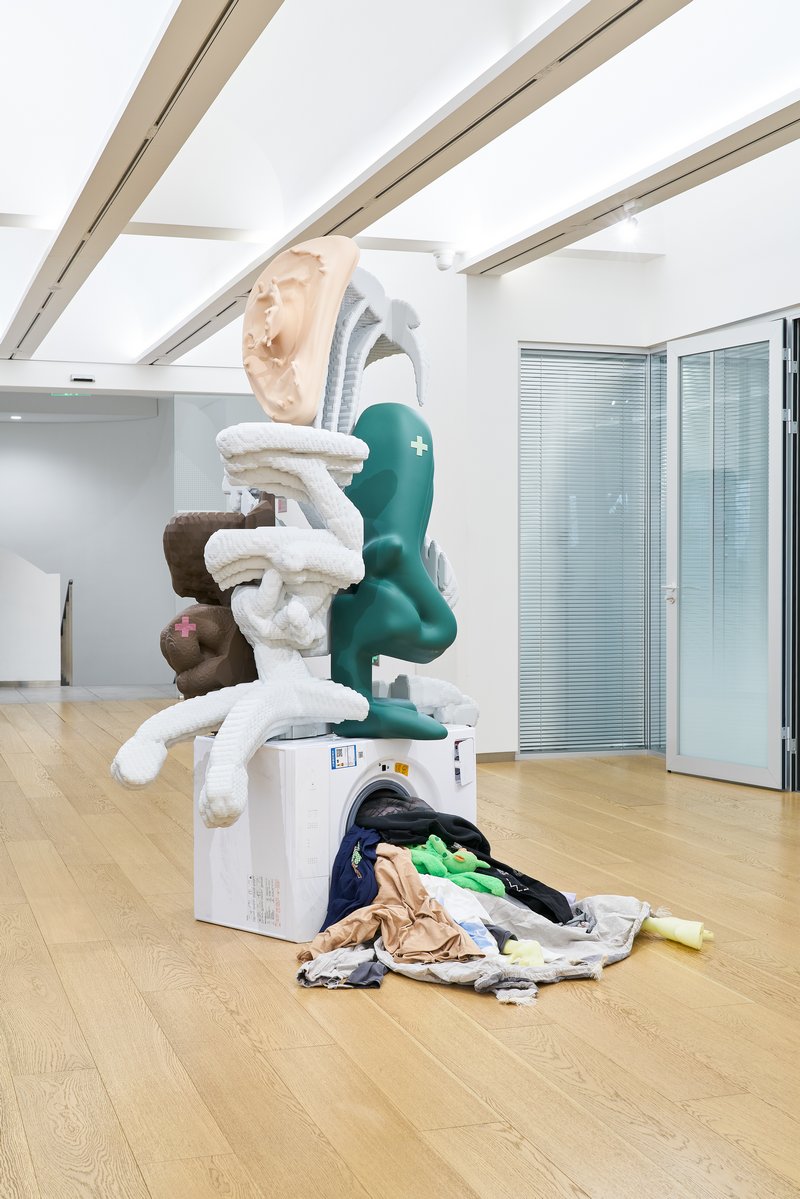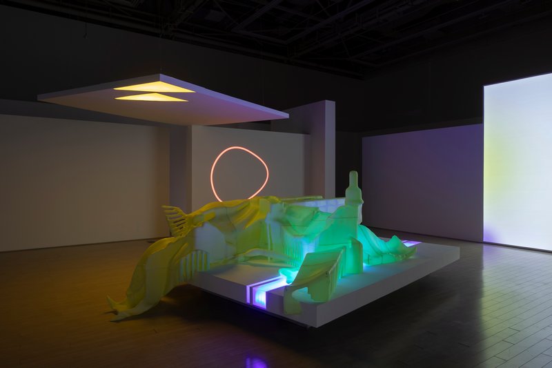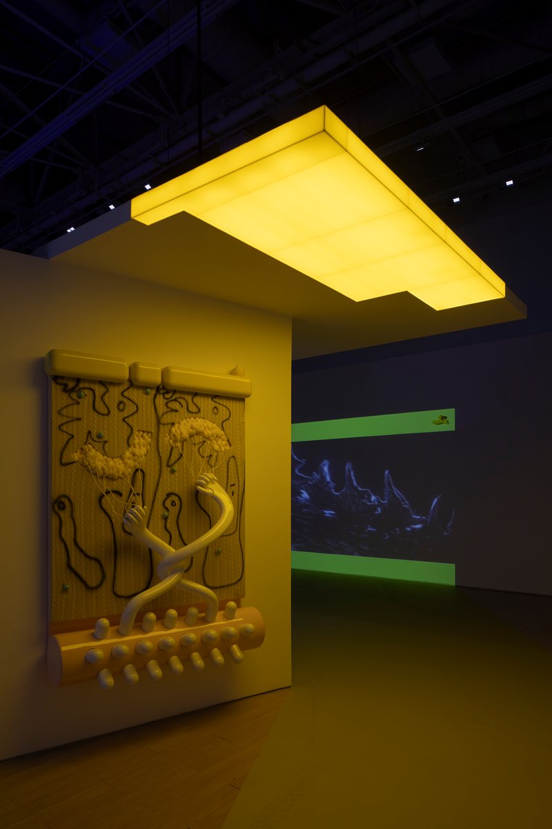 展览将这一逻辑转译为空间结构,整个现场被构建为可循环的模块系统。影像、雕塑、绘画与灯光作品被置入统一的光源与秩序之中,形成彼此独立又相互联动的感知节点。观众在其中行走、停留,如同步入一套被配置好的“疗养套餐”,在不同单元之间感受节奏、强度与密度的变化。
