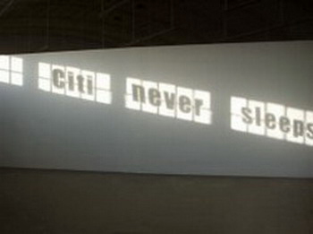 进入画廊空间,观众可能什么也看不到——只有在晴天的时候(这个季节的北京晴天其实很少),观众才可能会在画廊的地板上看到一些字的影子。这些字安装在画廊西墙的高窗上,内容是一堆银行的广告语:如花旗银行的“Citi never sleeps”,它旁边是摩根斯坦利银行的“World Wise”, 这些宣传语像是偶发诗歌的句子。午后,阳光将这些宣传口号的影子投射在画廊光秃秃的水泥地板上。