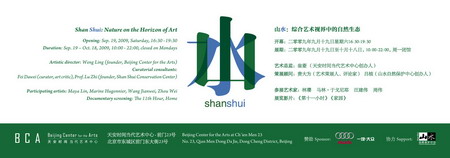 《山水——综合艺术视界中的自然生态》将于2009年9月19日-10月18日在天安时间当代艺术中心举办,由一汽-大众奥迪品牌独家赞助,山水•自然保护中心协力。展览以严肃、多元的视角、丰富的呈现方式,集合了林璎(Maya Lin)、马林•于戈尼耶(Marine Hugonnier)、汪建伟、周伟等国际一线艺术家、建筑师根据天安时间空间的最新力作,以及国际著名影星列奥纳多•迪卡普里奥制片的纪录片《第十一个小时》和法国著名摄影师扬恩•亚瑟-伯特拉德(Yann Arthus-Bertrand)导演、国际著名导演吕克•贝松监制的影片《家园》 ,以大型视觉艺术展、纪录片放映、外围环保计划、环保主题论坛、出版等多种形式,在邀请观众全方位体验当代艺术作品的同时,积极参与自然生态问题的思考与讨论,进而投身到科学、公益的“绿色运动”中去。其中环保主题论坛还将邀请自然生态环境保护领域的专家和国际知名艺术家参与跨学科讨论,也将形成丰富深度的文本资料,对未来学科发展起到积极的促进作用。