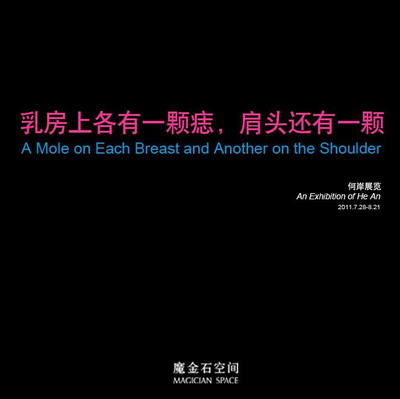 魔金石空间将于2011年7月28日开始展出艺术家何岸2011年新作《乳房上各有一颗痣,肩头还有一颗》。何岸70年代出生于武汉,以其系列灯箱作品为人所熟识。何岸的作品总是表现着他对介入、交流和创造紧张情绪的想法,这些想法持续存在于他的创作中,并达到了不可预知的结果。此次在魔金石空间,何岸将改变空间原有结构并建构一条狭窄通道。穿过通道是否有更多私密体验?届时,一切的感知将从这里一“触”即发。