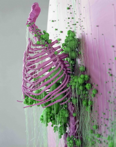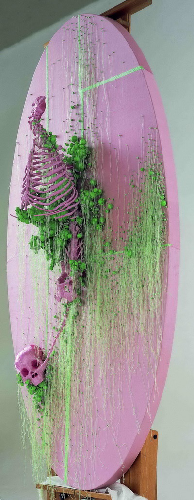 林天苗是一位永远充满旺盛精力、永远愿意在否定和挑战自己中不断实现蜕变的艺术家,因此她的每一次出场都如华丽霸气女王般让人大呼过瘾。本次展览中,她秉承一贯标志性的超级手工技艺,甚至更加推向极致,并且大胆尝试对已具有相当社会认可度的平面作品进行立体化处理:不仅几百件被各色棉线缠绕或被金箔包贴的大小不一、形状各异的动物和人类骨骼、金属工具以及木头,单看已是超乎想象的精美艺术品,而且以这些蕴含极大工作量的奢侈“精灵”为主角的艺术中心空间还将在短短一个月内完成惊艳变装!包裹、分割、悬吊、重组等所有可以想见的艺术表现手法都会在天安时间魔幻登场。主打作品《N年的一样》用彩色的棉线织绘出一幅别样的“爆炸风景”,配以金箔包裹的各种骨骼零件组成的夸张外框,让人不禁联想起福岛核电站爆裂或2012世界末日预言来临后的可能未来。而特别为天安空间量身创作的现场装置《一样》,也将因极度“奢侈”的视觉观感非常令人期待!