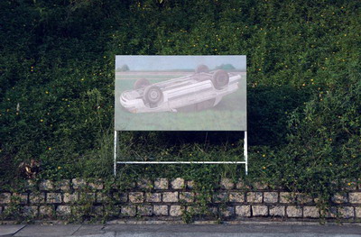 In the exhibition's title piece "Safety Island", a smooth marble-like beach raft floats steadily in the placid waters. The tranquil seascape seems to be unperturbed by this alien construction. In "A Drowsy Car", an overturned vehicle lolls unscathed in the soft meadow. In the absence of casualty and destruction, this pastoral scene of accident is neither violent nor distressful. Its composition points to surrender as the artist beckons to reconcile with the unperfected nature of life. Through this series of work, Lai deals with defeatism and unsentimentally offers remission.