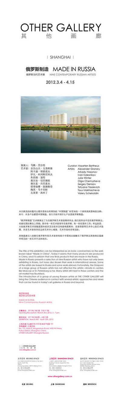 本次展览的标题可以看作是给众所周知的“中国制造”标签加的一个具有讽刺意味的注脚。如今,许多产品都是中国制造,却几乎找不到什么产品是俄罗斯制造。 “俄罗斯制造”艺术展展出了九位俄罗斯艺术家的精选作品,他们的作品不仅在俄罗斯展出,也曾在国际舞台上亮相。其中有一些艺术家常年在俄罗斯,有一些在国外工作。幸运的是,大批俄罗斯艺术家散居国外的状况目前并没有影响莫斯科、圣彼得堡等艺术中心的艺术氛围,许多艺术家依然在这些艺术中心碰面,艺术市场也非常活跃。 其他画廊引入的数位俄罗斯年轻艺术家将有助于中国观众接触当下俄罗斯及其他地区画廊中常见的一些艺术手法和观点。
