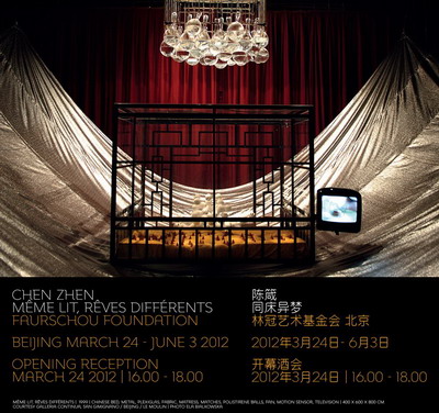 The title of the show, Même lit, rêves diffèrents, stems from a large installation in the exhibition which poetically encapsulates Chen Zhen's art. Même lit, rêves diffèrents (1999) is a complex installation with a large piece of fabric suspended from the ceiling, a cage with a landscape, a grid with medical glass retorts and a TV screen. The piece gathers many of the themes central in Chen Zhen's art: the harmony between body and spirit, the fraternity between different peoples and cultures, the resolution of conflicts, and fruitful engagement between East and West.