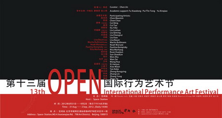 第十三届OPEN国际行为艺术节将于2012年8月31日至9月2日每天下午14:00开始,在北京798艺术区空间站画廊举行,持续3天下午。本次艺术节邀请了来自中国、德国、波兰、挪威等各国20余位行为艺术家参与表演实施。