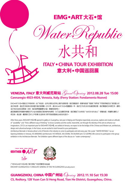 威尼斯建筑双年展每年都吸引不少业内的朋友们前来参与与参观,为了这次建筑双年展,我们策展了《水共和》“WATER REPUBLIC”,群展包括:何健翔(建筑)/ 何汶玦、吴达新、戴秀慧(艺术)/卢思骋(生活科学)用不同的层面表达水的当代启示。威尼斯EMG?ART大石?馆开幕展《水共和》在意大利得到市政府、学术界、建筑师、设计师及新闻界的大力支持,使我们的开幕生色不少也同时在FaceTalk“建筑的现代姿态”深入探讨建筑、历史、土地与人的现代意识与态度。