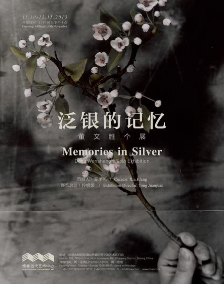 蜂巢当代艺术中心将于2013年11月30日下午四点推出全新展览《泛银的记忆:董文胜个展》。董文胜的创作既有基于中国传统文化元素的个人美学特征,又弥漫着诗意而隐喻的影像语言。展出的摄影作品主要是银盐照片,艺术家以这”泛银“的媒介拼凑出往昔生活的记忆碎片。