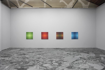 此次展览,北京公社和艺术家花了大量的心思和精力进行布展。展厅的地面全部被垃圾场的黑白照片铺满,展厅墙壁也被刷成理性的高级灰,和色彩艳丽斑斓的绘画形成了鲜明的对比。“我的工作室黑桥附近有一大片垃圾场,这很象中国当下的状况,是我作品创作生长的背景。在这种混乱的背景下,我只有在创作中追求一种理性的极致。”